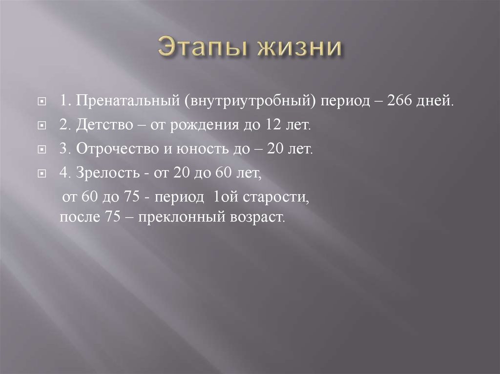 1. Пренатальный (внутриутробный) период – 266 дней.2. Детство – от рождения до 12 лет.