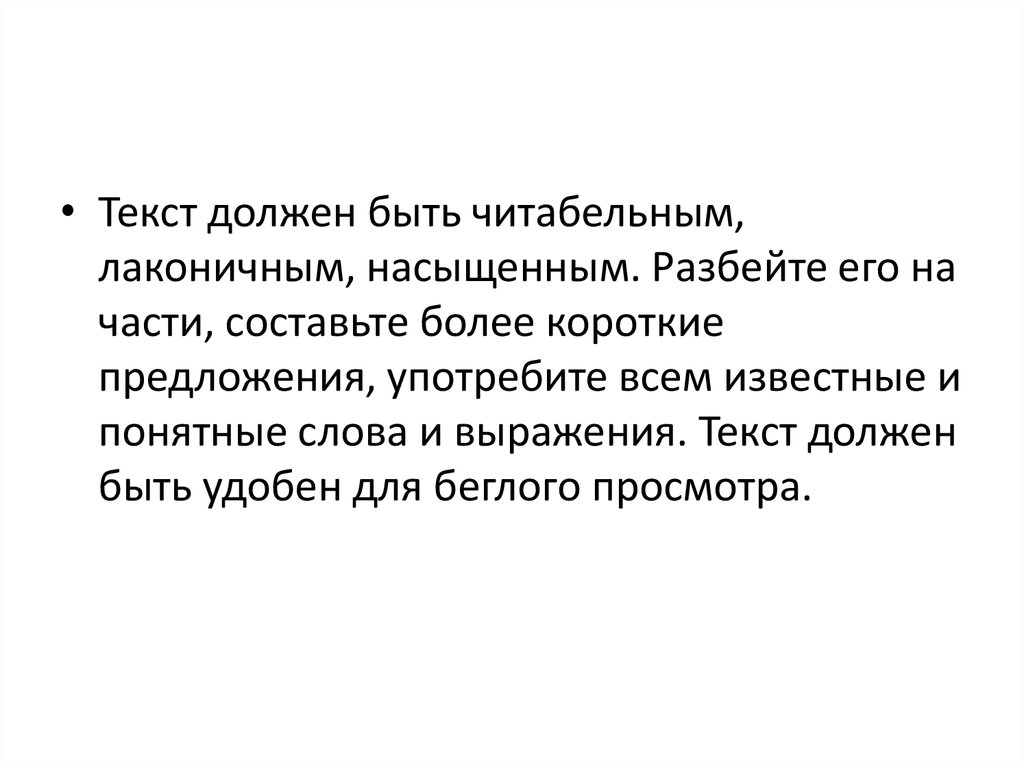 • Текст должен быть читабельным,лаконичным, насыщенным. Разбейте его на