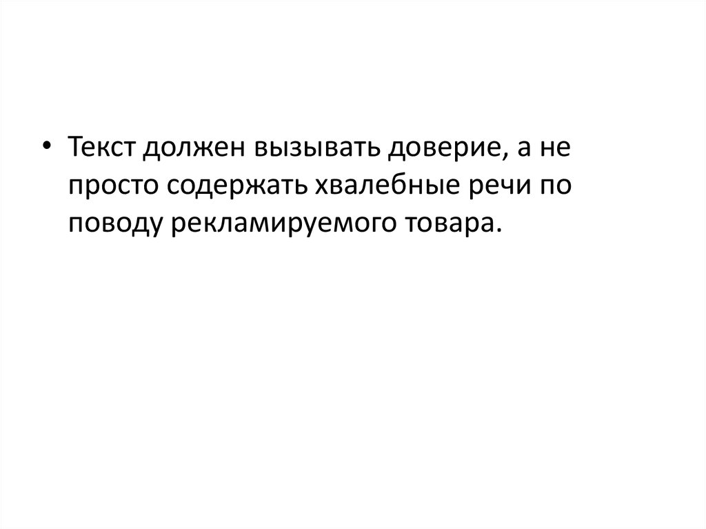 • Текст должен вызывать доверие, а непросто содержать хвалебные речи по