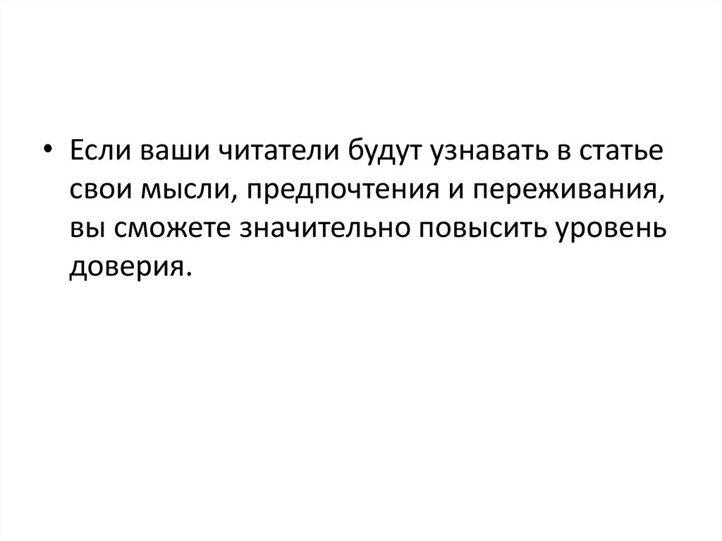 • Если ваши читатели будут узнавать в статьесвои мысли, предпочтения и переживания,