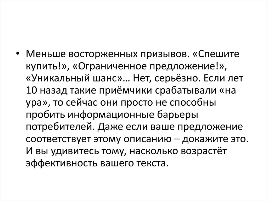 • Меньше восторженных призывов. «Спешитекупить!», «Ограниченное предложение!»,