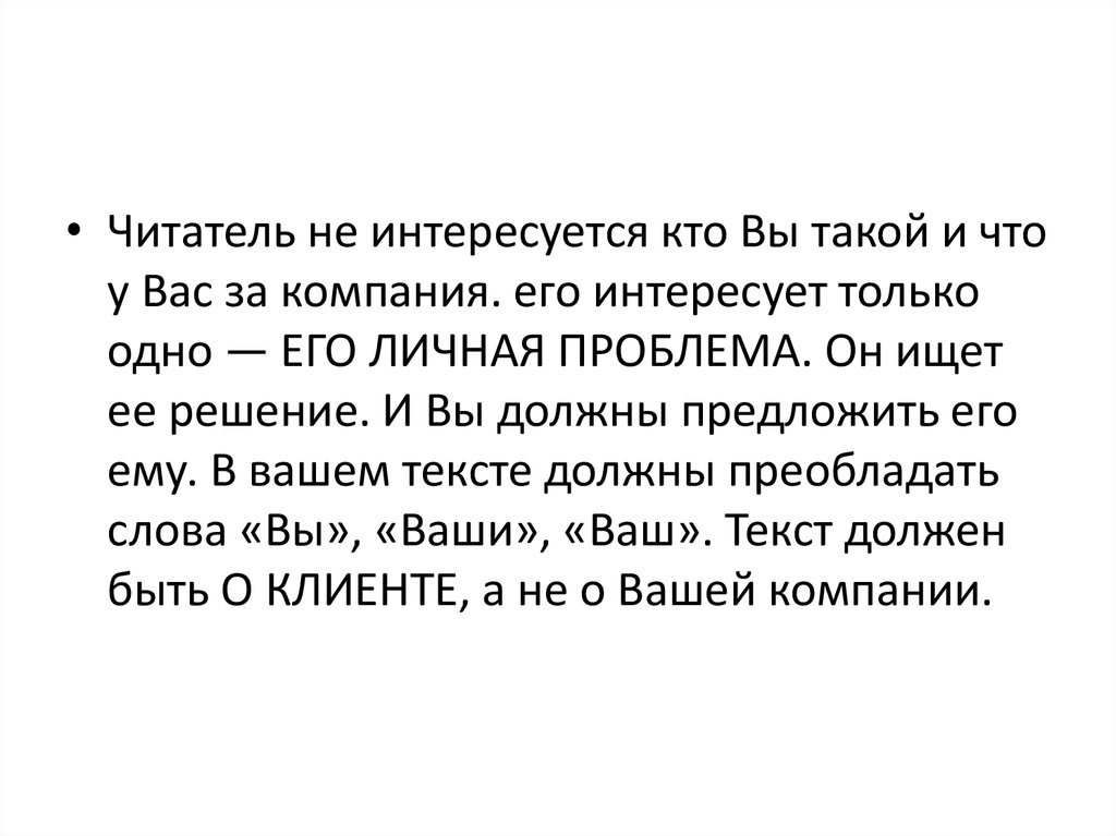 • Читатель не интересуется кто Вы такой и чтоу Вас за компания. его интересует только