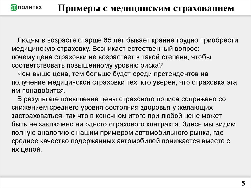 Примеры с медицинским страхованиемЛюдям в возрасте старше 65 лет бывает крайне трудно приобрести
