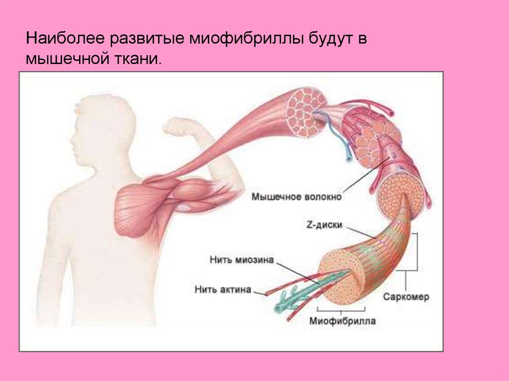 Наиболее развитые миофибриллы будут вмышечной ткани.
