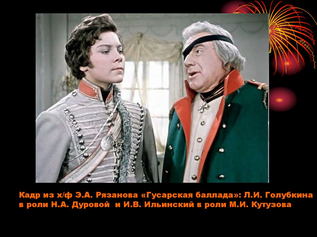Кадр из х/ф Э.А. Рязанова «Гусарская баллада»: Л.И. Голубкинав роли Н.А. Дуровой и И.В. Ильинский в роли М.И. Кутузова