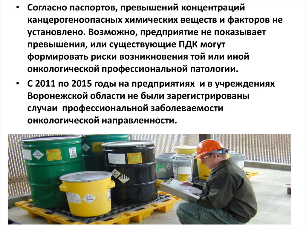 • Согласно паспортов, превышений концентрацийканцерогеноопасных химических веществ и факторов не