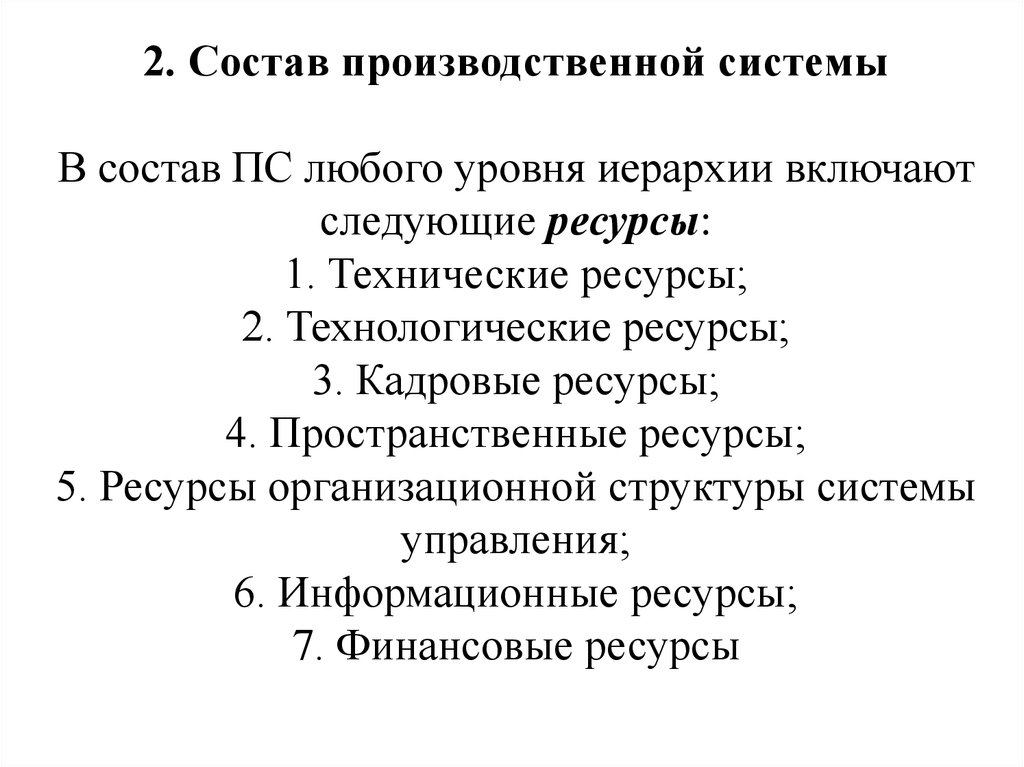 2. Состав производственной системыВ состав ПС любого уровня иерархии включают