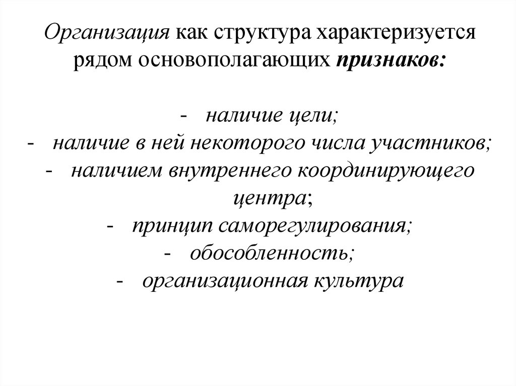 Организация как структура характеризуетсярядом основополагающих признаков: