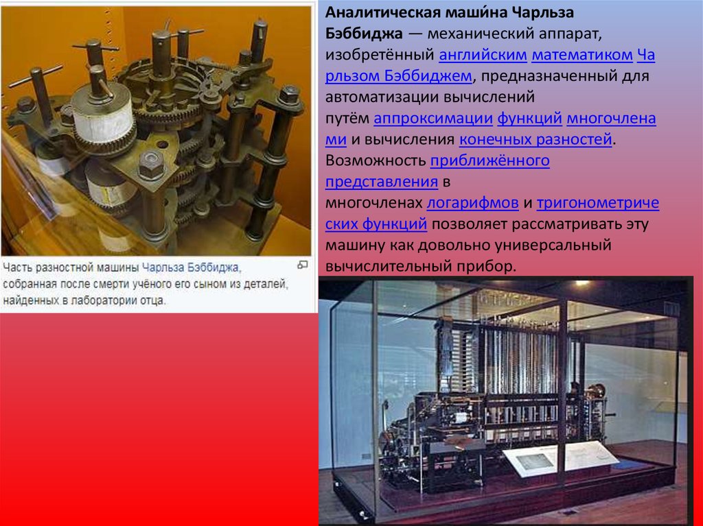 Аналитическая маши́ на ЧарльзаБэббиджа — механический аппарат,