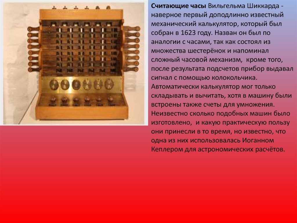 Считающие часы Вильгельма Шиккарда наверное первый доподлинно известныймеханический калькулятор, который был