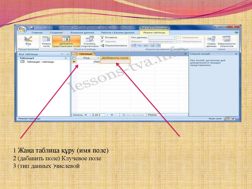 1 Жаңа таблица құру (имя поле)2 (дабавить поле) Клучевое поле