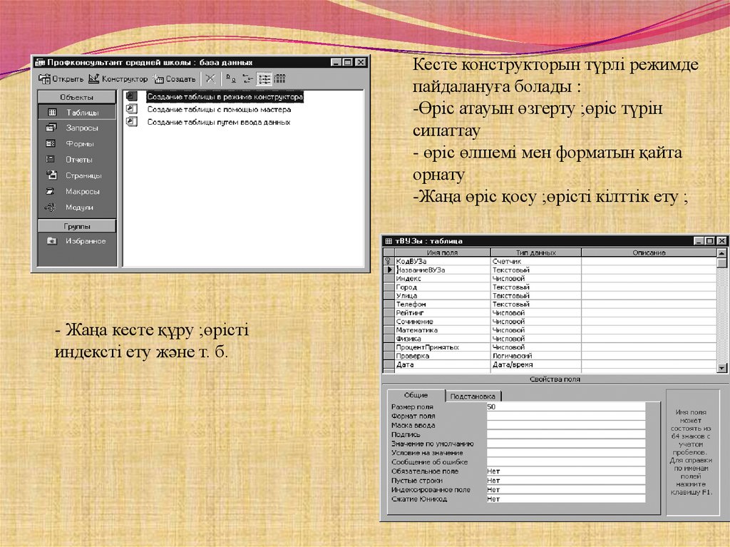 - Жаңа кесте құру ;өрісті