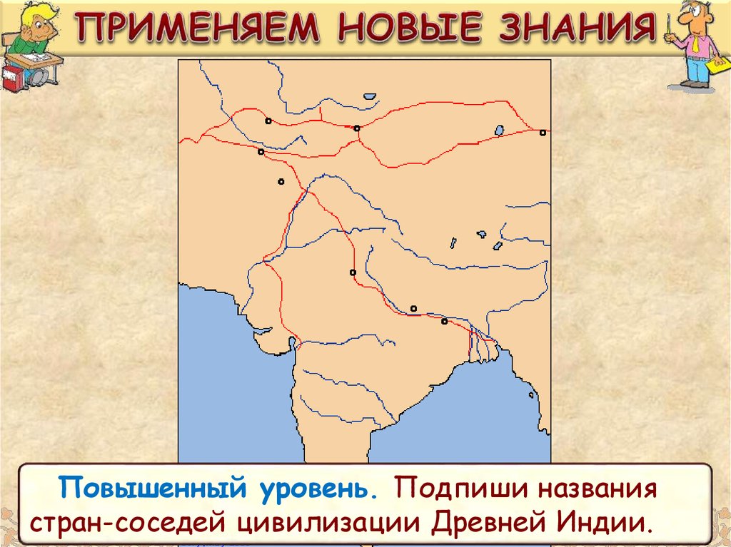 Повышенный уровень. Подпиши названиястран-соседей цивилизации Древней Индии.