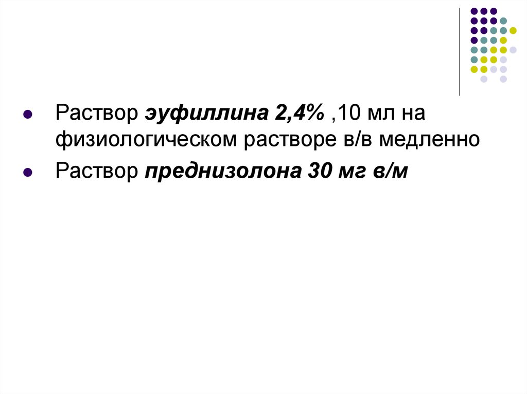 Раствор эуфиллина 2,4% ,10 мл нафизиологическом растворе в/в медленно