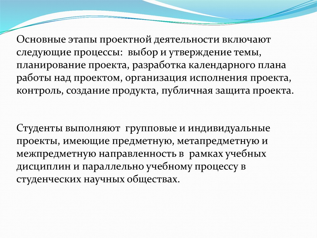 Основные этапы проектной деятельности включаютследующие процессы: выбор и утверждение темы,