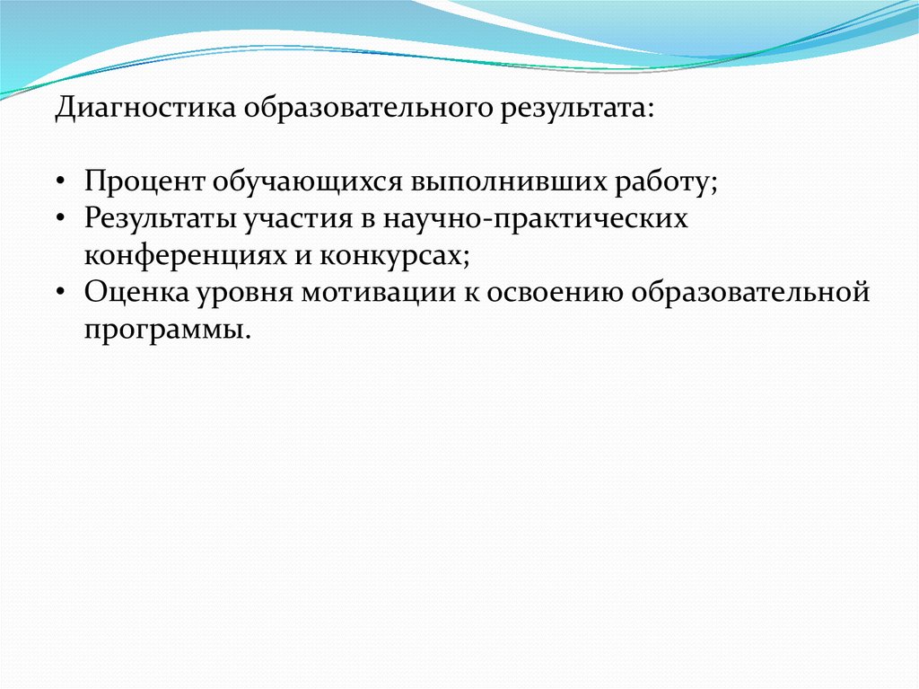 Диагностика образовательного результата:• Процент обучающихся выполнивших работу;
