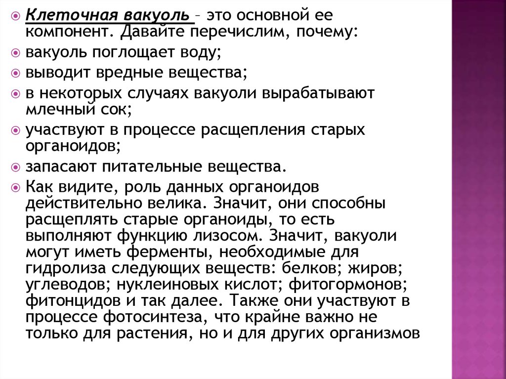 Клеточная вакуоль – это основной еекомпонент. Давайте перечислим, почему: