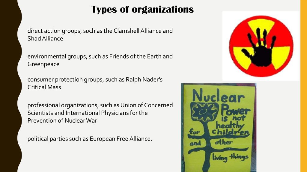 Types of organizationsdirect action groups, such as the Clamshell Alliance and