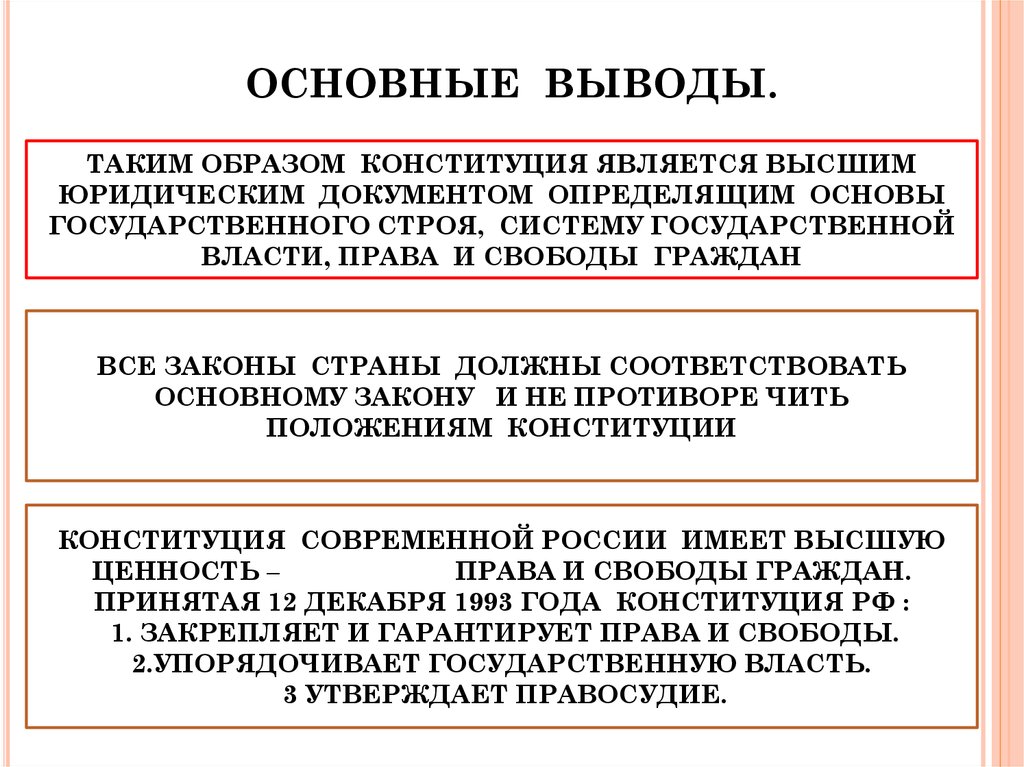 ОСНОВНЫЕ ВЫВОДЫ.ТАКИМ ОБРАЗОМ КОНСТИТУЦИЯ ЯВЛЯЕТСЯ ВЫСШИМ