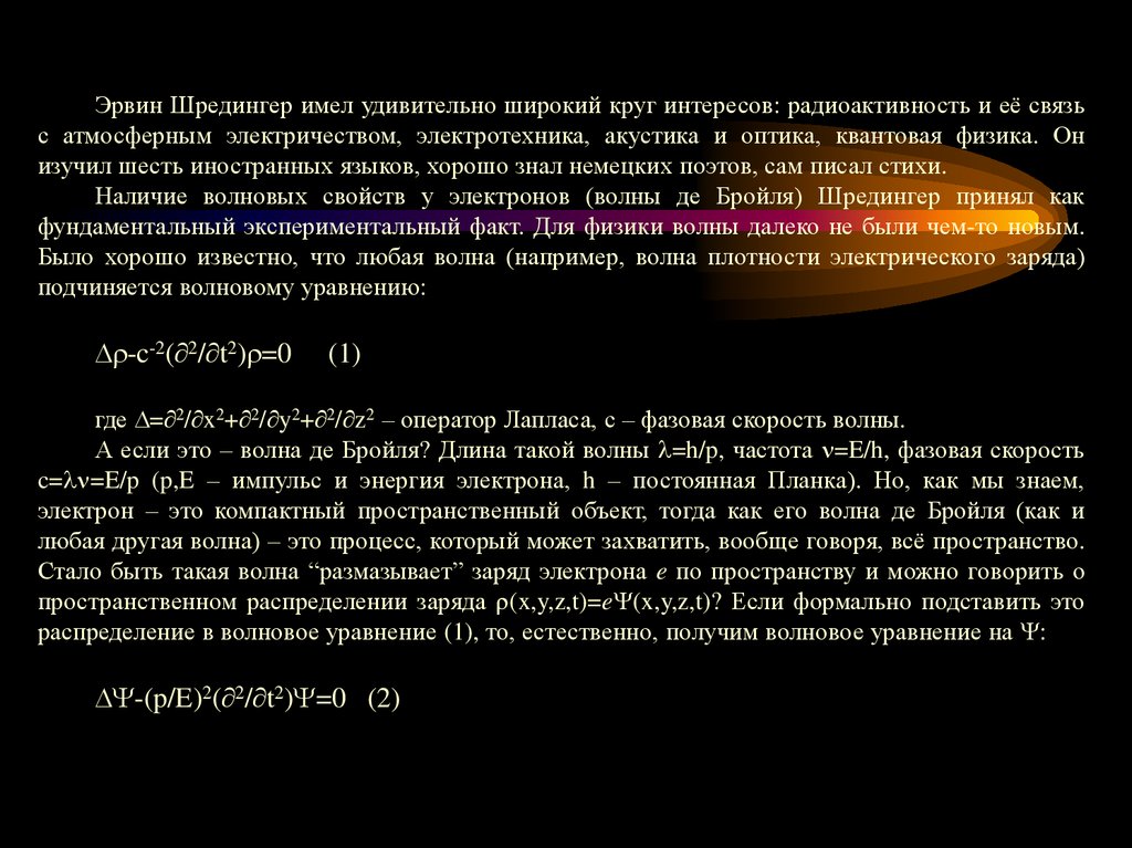 Эрвин Шредингер имел удивительно широкий круг интересов: радиоактивность и её связьс атмосферным электричеством, электротехника, акустика и оптика, квантовая физика. Он
