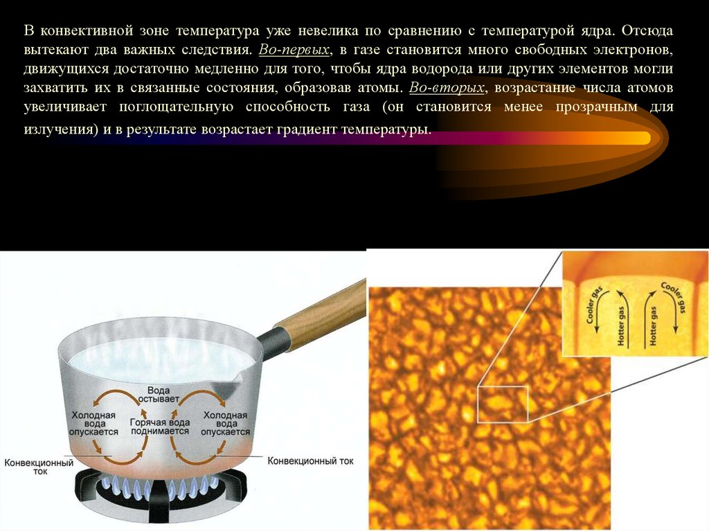 В конвективной зоне температура уже невелика по сравнению с температурой ядра. Отсюдавытекают два важных следствия. Во-первых, в газе становится много свободных электронов,