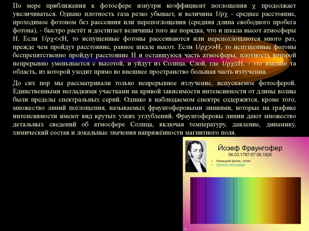 По мере приближения к фотосфере изнутри коэффициент поглощения продолжаетувеличиваться. Однако плотность газа резко убывает, и величина 1/ - среднее расстояние,
