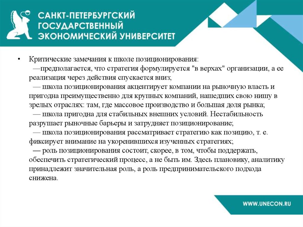 — школа позиционирования рассматривает стратегию как позицию, т. е.