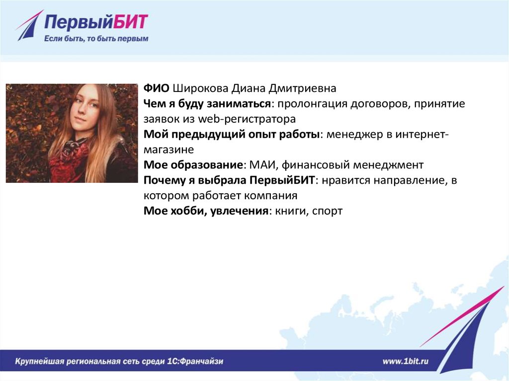 ФИО Широкова Диана ДмитриевнаЧем я буду заниматься: пролонгация договоров, принятие