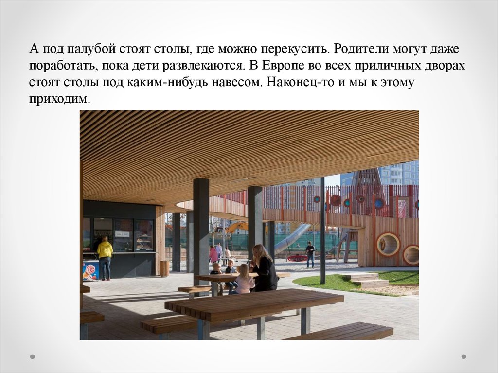 А под палубой стоят столы, где можно перекусить. Родители могут дажепоработать, пока дети развлекаются. В Европе во всех приличных дворах