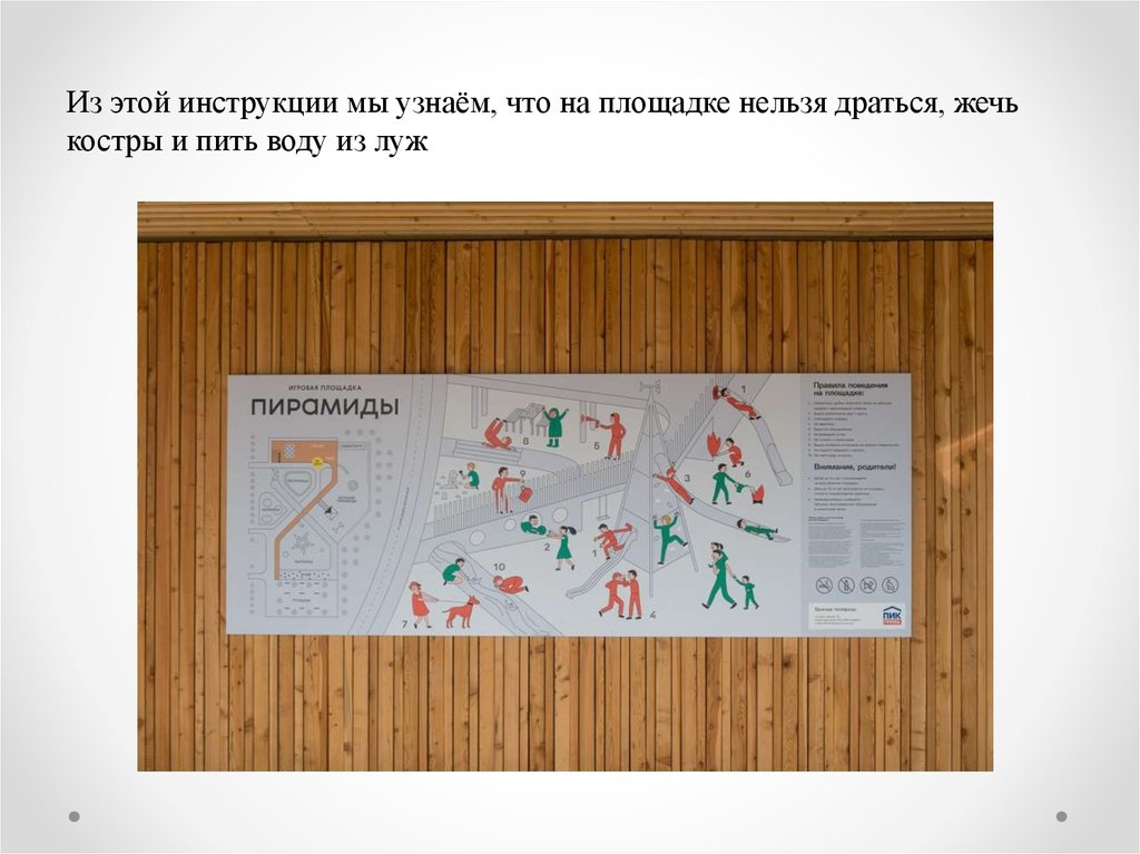 Из этой инструкции мы узнаём, что на площадке нельзя драться, жечькостры и пить воду из луж