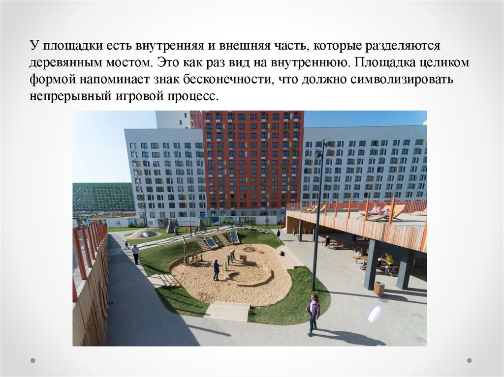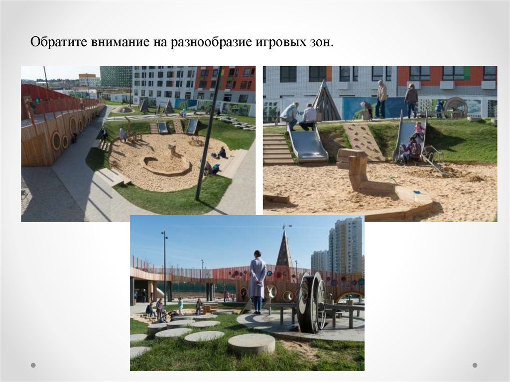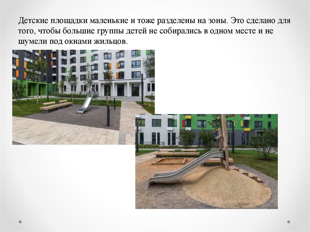 Детские площадки маленькие и тоже разделены на зоны. Это сделано длятого, чтобы большие группы детей не собирались в одном месте и не