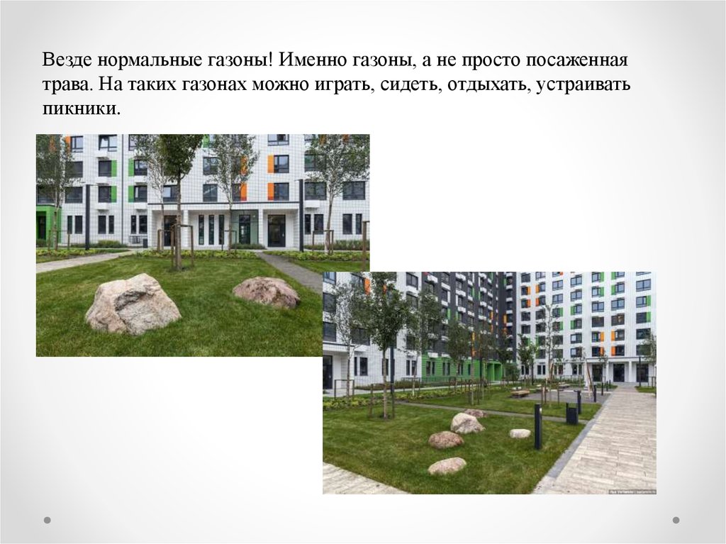 Везде нормальные газоны! Именно газоны, а не просто посаженнаятрава. На таких газонах можно играть, сидеть, отдыхать, устраивать