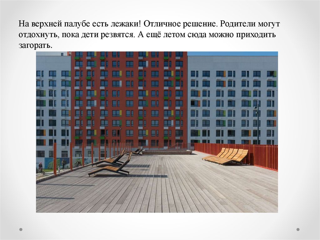 На верхней палубе есть лежаки! Отличное решение. Родители могутотдохнуть, пока дети резвятся. А ещё летом сюда можно приходить