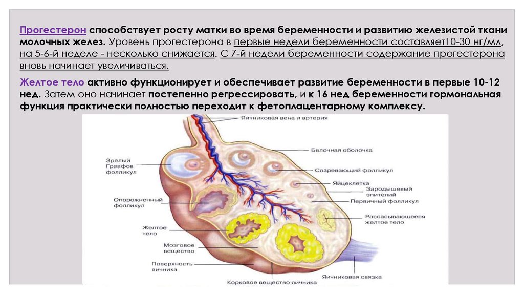 Прогестерон способствует росту матки во время беременности и развитию железистой тканимолочных желез. Уровень прогестерона в первые недели беременности составляет10-30 нг/мл,