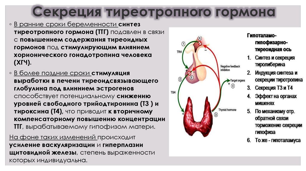 ◦ В ранние сроки беременности синтезтиреотропного гормона (ТТГ) подавлен в связи
