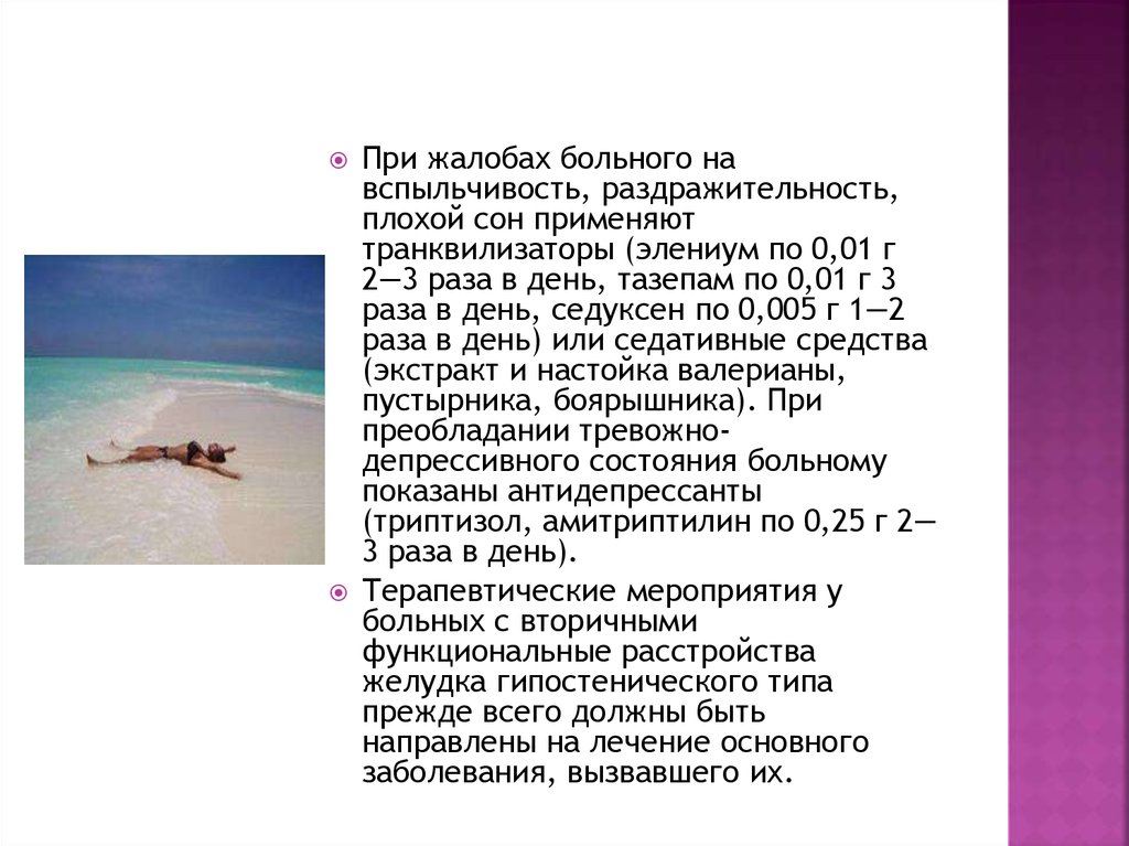 При терапии следует учитывать тип функциональныхрасстройств желудка.