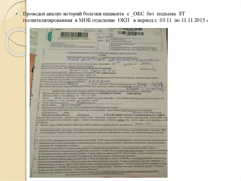 Проведен анализ историй болезни пациента с _ОКС без подъема STгоспитализированная в МОБ отделение ОКП в период с 03.11 по 11.11.2015 г