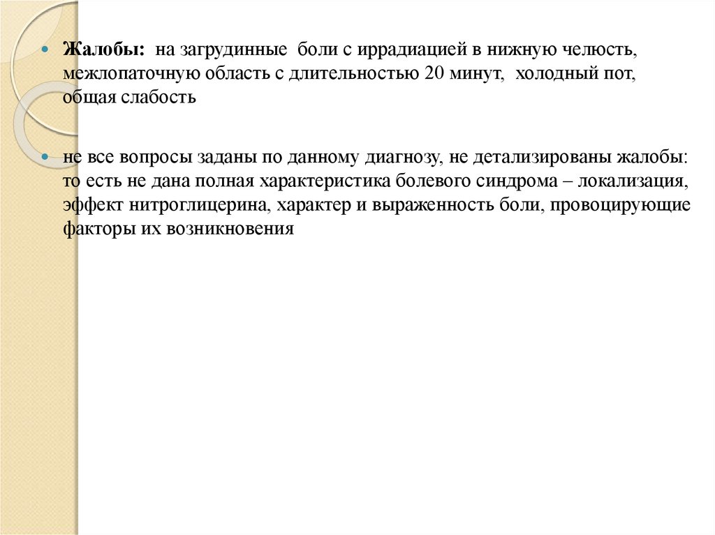 Жалобы: на загрудинные боли с иррадиацией в нижную челюсть,межлопаточную область с длительностью 20 минут, холодный пот,