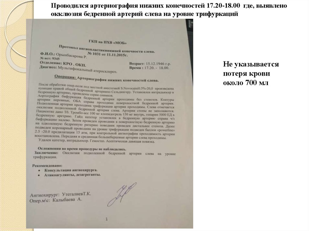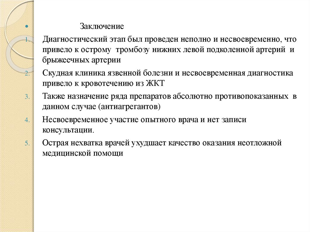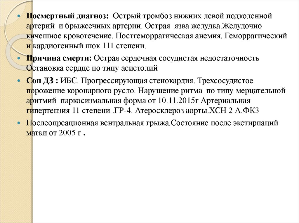 Посмертный диагноз: Острый тромбоз нижних левой подколеннойартерий и брыжеечных артерии. Острая язва желудка.Желудочно