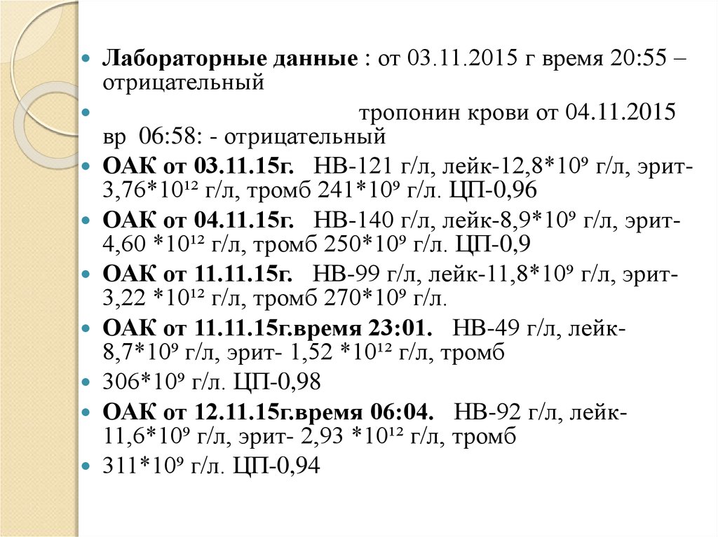 ОАК от 03.11.15г. НВ-121 г/л, лейк-12,8*10⁹ г/л, эрит3,76*10¹² г/л, тромб 241*10⁹ г/л. ЦП-0,96