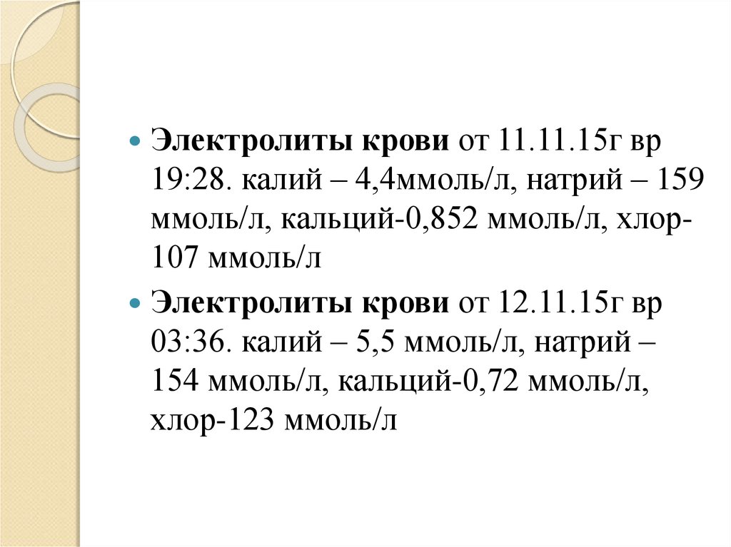 Электролиты крови от 11.11.15г вр19:28. калий – 4,4ммоль/л, натрий – 159