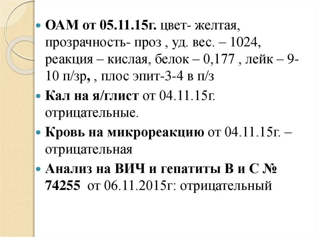 ОАК от 04.11.15г. НВ-140 г/л, лейк-8,9*10⁹ г/л, эрит4,60 *10¹² г/л, тромб 250*10⁹ г/л. ЦП-0,9