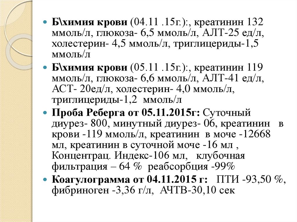 Б\химия крови (04.11 .15г.):, креатинин 132ммоль/л, глюкоза- 6,5 ммоль/л, АЛТ-25 ед/л,