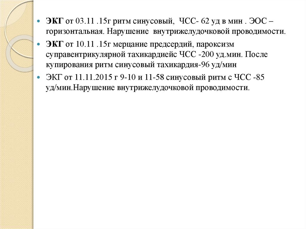 ЭКГ от 03.11 .15г ритм синусовый, ЧСС- 62 уд в мин . ЭОС –горизонтальная. Нарушение внутрижелудочковой проводимости.