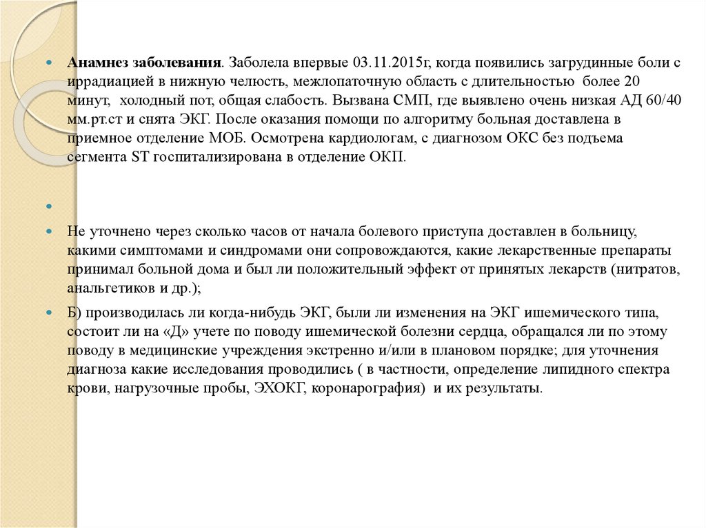 Анамнез заболевания. Заболела впервые 03.11.2015г, когда появились загрудинные боли сиррадиацией в нижную челюсть, межлопаточную область с длительностью более 20