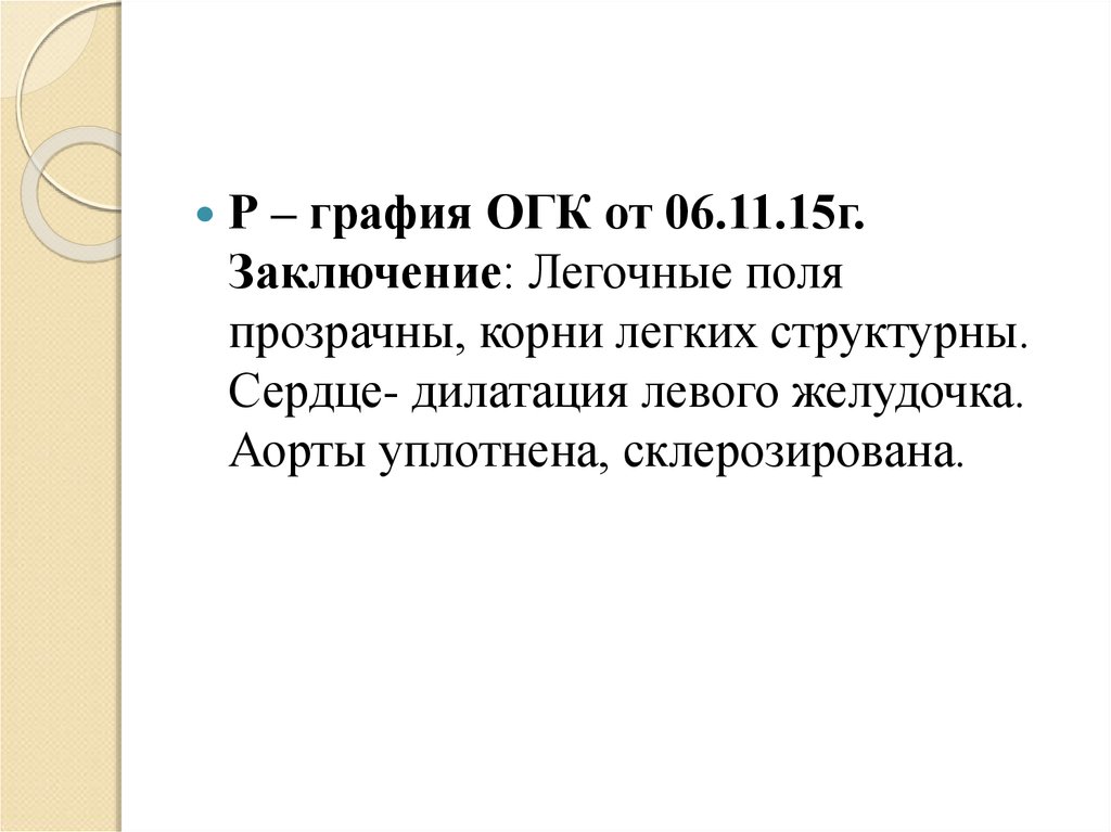 Р – графия ОГК от 06.11.15г.Заключение: Легочные поля