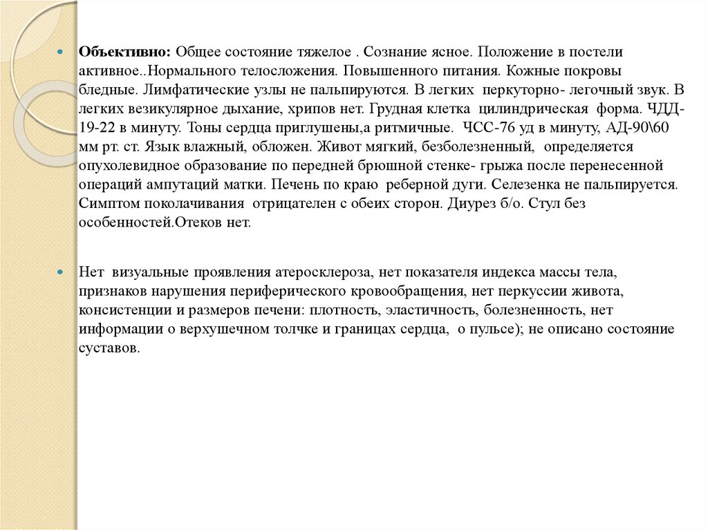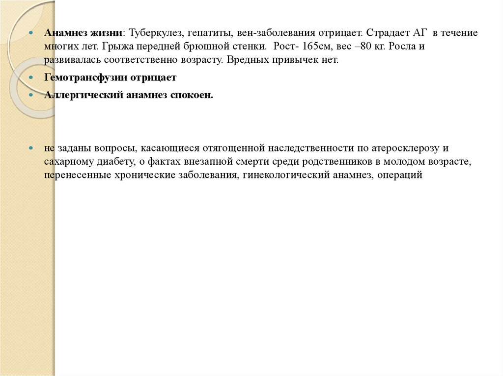 Анамнез жизни: Туберкулез, гепатиты, вен-заболевания отрицает. Страдает АГ в течениемногих лет. Грыжа передней брюшной стенки. Рост- 165см, вес –80 кг. Росла и