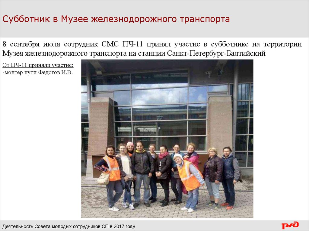 Субботник в Музее железнодорожного транспорта8 сентября июля сотрудник СМС ПЧ-11 принял участие в субботнике на территории