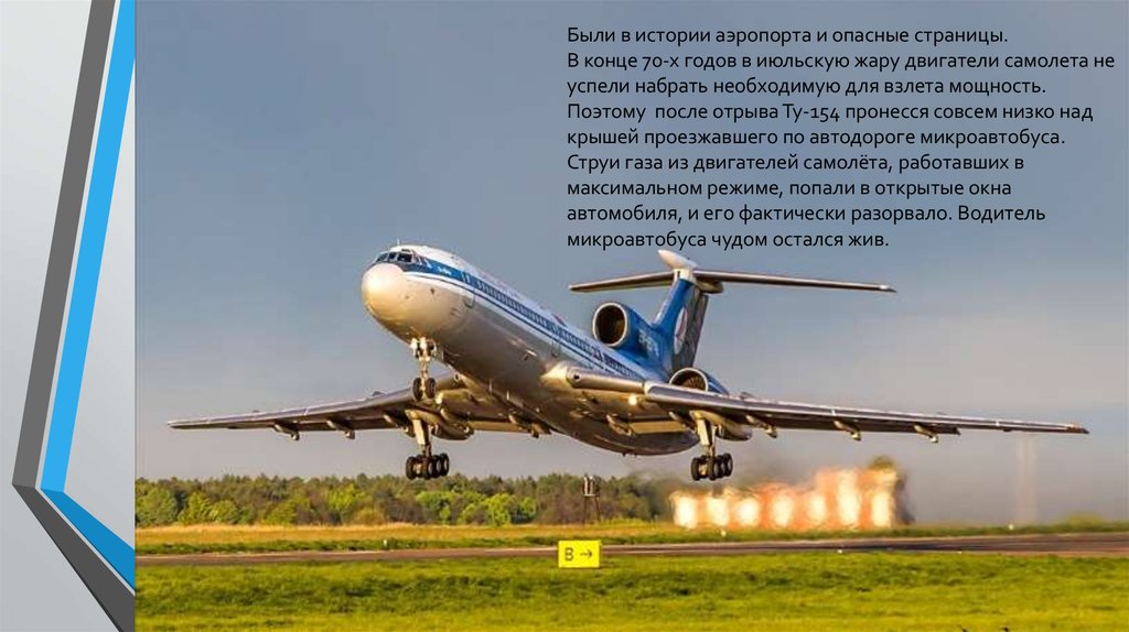 Были в истории аэропорта и опасные страницы.В конце 70-х годов в июльскую жару двигатели самолета не