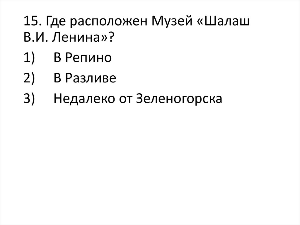 15. Где расположен Музей «ШалашВ.И. Ленина»?